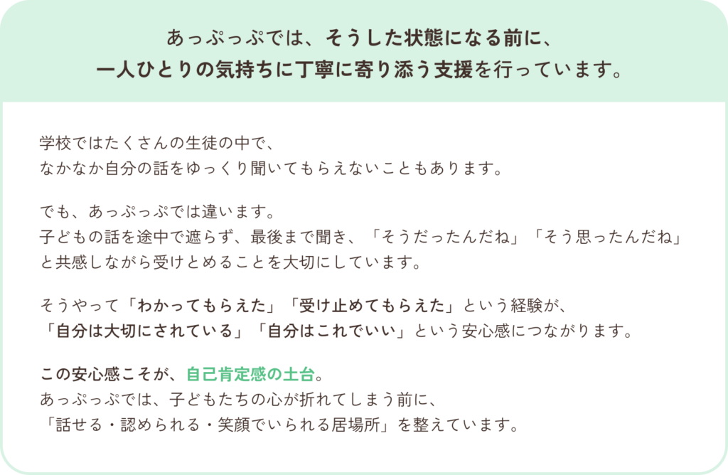 あっぷっぷでは、日々変化する子どもたちの様子を踏まえ、「その子に今、どんな関わりが最適か」 をスタッフ全員で丁寧に確認し合うことを何より大切にしています。